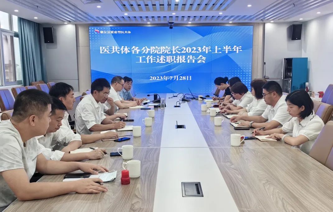 2023年7月28日,县医共体总医院组织各分院院长在五楼一号会议室召开2023年上半年工作述职报告会。县医共体党委副书记、总医院院长代有礼到会指导,医共体党委委员、县人民医院副院长苏云辉主持会议。