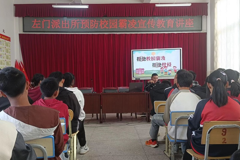 最后,县公安局左门派出所所长、左门中心小学法制副校长文斌围绕“预防校园霸凌”“预防性侵”“交通安全”“反邪教”四个主题进行宣传教育。