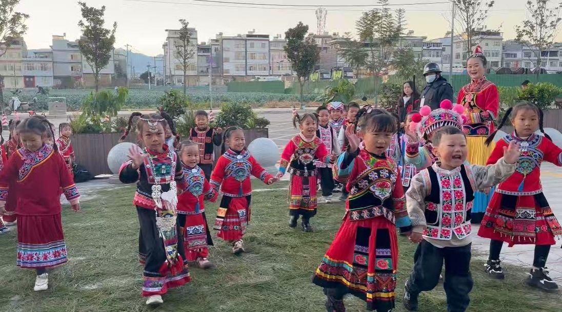 晨光初绽,幼儿园已悄然化身为一座生动的彝家文化村落。身着七彩彝装的教师与笑容灿烂的孩子们,组成一幅洋溢着民族风情的迎宾画卷。