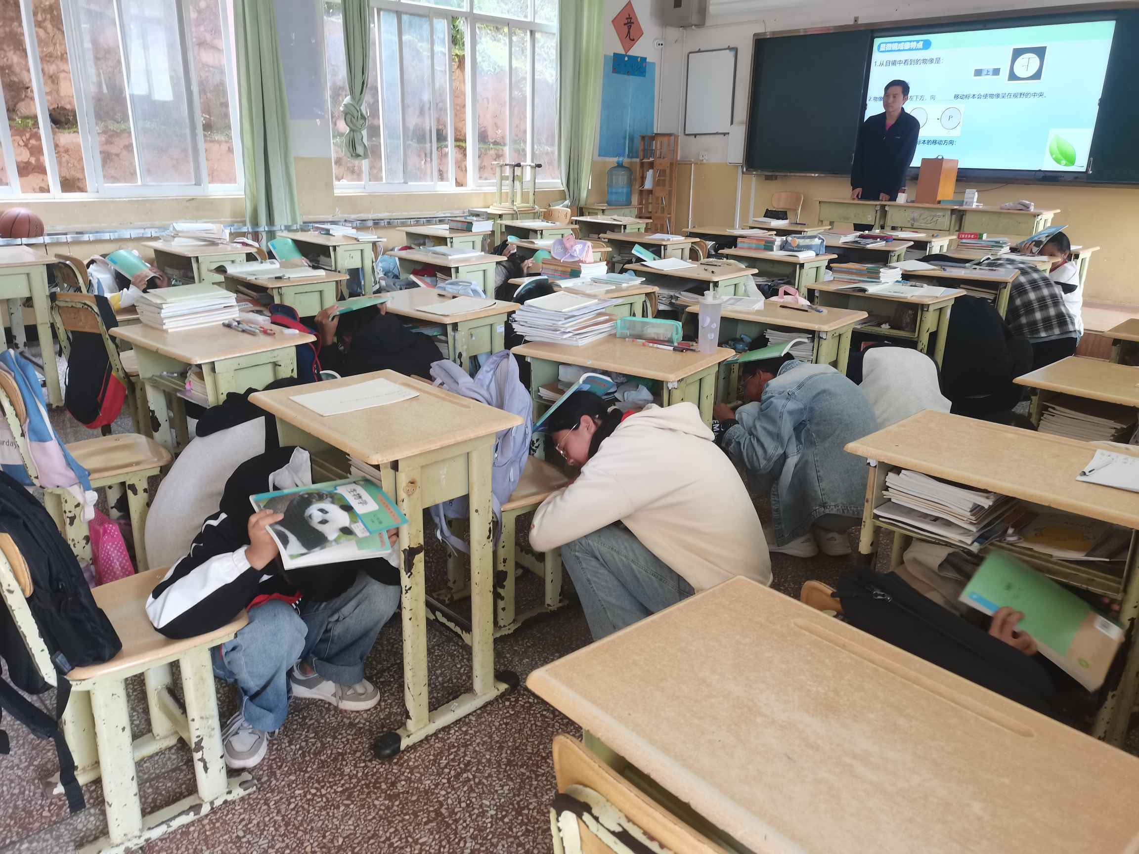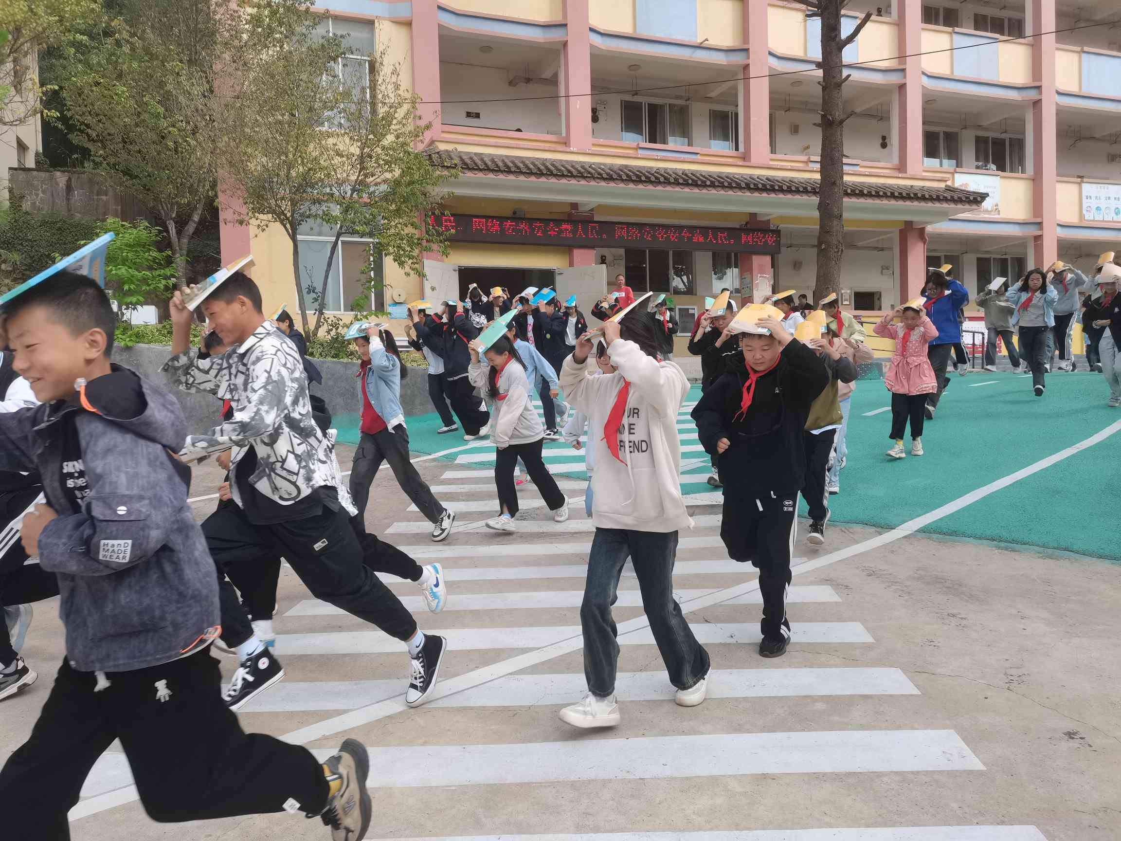 演练模拟了一次突发地震情景,随着第一声警报信号的响起,全体师生立即按照平时学习的应急程序行动起来。学生们迅速躲到课桌下,采取“趴下、掩护、握固”的自救姿势,以减少可能受到的伤害。随后,第二声警报响起,表示地震波已过,师生们按照既定路线,快速而有序地从教学楼撤离到开阔的安全地带,整个过程紧张而有序,展现了师生们良好的应急素养。
