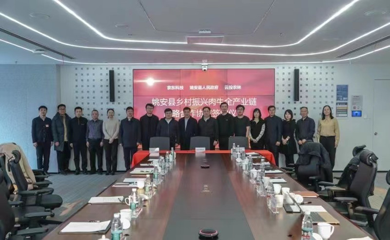 代表团一行来到京东集团,通过考察京东现代化产业智慧物流园区亚洲一号仓和京东集团总部,详细了解京东智慧物流体系发展和乡村振兴产业发展前景等情况,随后与京东集团副总裁、京东科技农业金融科技部总裁区力以及负责乡村振兴领域的负责人展开座谈。座谈会上,政企三方围绕姚安县乡村振兴肉牛全产业链发展现状及产品委托销售合作项目如何发挥各自优势、深化务实合作做了深入沟通交流,并签订了姚安县乡村振兴肉牛全产业链发展项目投资合作框架协议,为肉牛全产业链发展奠定基础。