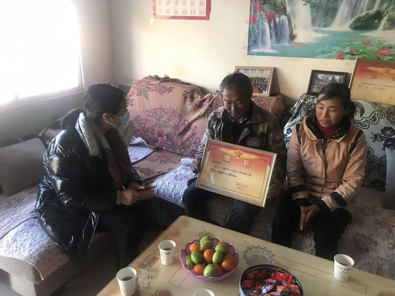在三等功获得者金成杰家中,县退役军人局副局长刘秀与其父母促膝交谈,并代表县委、县政府感谢他们为党和国家培养优秀人才以及其儿子为国家做出的卓越贡献,鼓励他们保持积极乐观的心态,树立信心,积极战胜困难,并为他们送上了立功受奖喜报和慰问金,向他们表达了节日的祝贺。