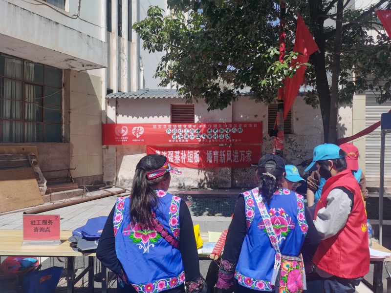 2024年3月10日,农历二月初一,是姚安县前场镇一年一度的开街节,街上人山人海,热闹非凡。借此契机,姚安县民政局携手县妇联、县检察院、县共青团、姚安县初心社会工作服务中心和前场社工站在前场镇街道上开展“普法强基补短板 婚育新风进万家”宣传活动。