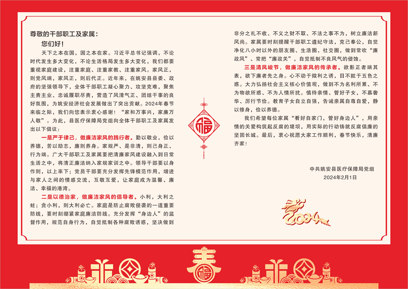 春节将至,持续加固中央八项规定堤坝,强化节日作风建设,严防节日“四风”问题,营造廉洁和谐、风清气正的节日氛围,2024年2月4日下午,姚安县医疗保障局开展党风廉政建设警示教育暨春节前廉政提醒集体谈话,并组织开展廉政家访。