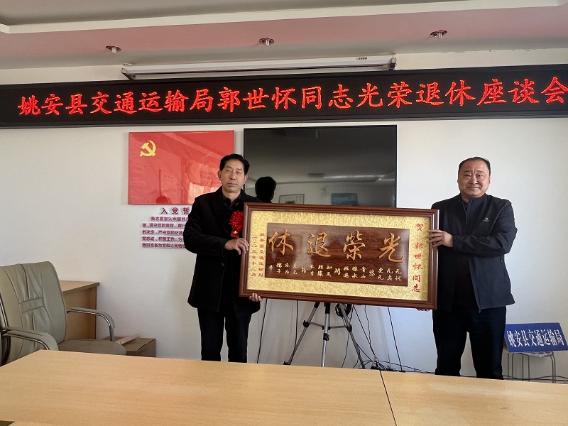 县交通运输局党组书记、局长班锋为郭世怀颁发光荣退休牌匾,并代表县交通运输局表达了祝贺与祝福,祝贺他光荣退休,对他不忘初心使命,立足岗位默默耕耘,为姚安交通运输事业所作出的贡献表示衷心感谢。希望郭世怀退休后做到退休不褪色,离岗不离党,充分发挥政治优势、经验优势,为姚安交通运输事业发展建言献策,贡献余热。同时要求交通运输局全体干部职工要学习郭世怀同志无私奉献、一心为公的宝贵精神,传承优良作风,砥砺前行,奋力推进姚安交通运输高质量发展。