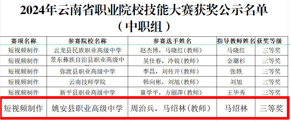 近日,我校代表队在2024年云南省职业院校技能大赛短视频制作的激烈角逐中,凭借出色的创意和精湛的技术,荣获了三等奖的佳绩,为学校赢得了荣誉,也展现了我校电子商务专业班学生的卓越才华。