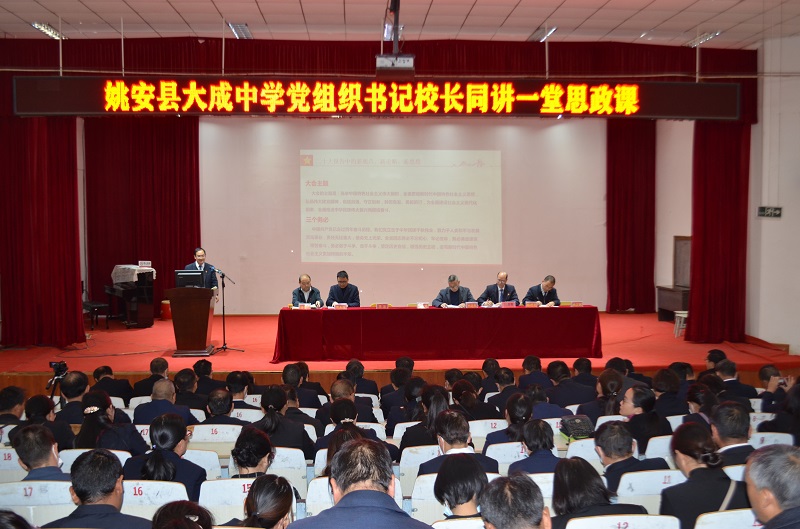 为深入学习贯彻党的二十大精神,贯彻落实中共中央办公厅、国务院办公厅《关于深化新时代学校思想政治理论课改革创新的若干意见》。根据中共云南省委教育工委、云南省教育厅《关于组织全省学校党组织书记校长同讲一堂思政课的通知》精神。2022年11月25日下午,姚安县大成中学开展党组织书记、校长“同讲一堂思政课”活动,全校150名教职工参加该活动。