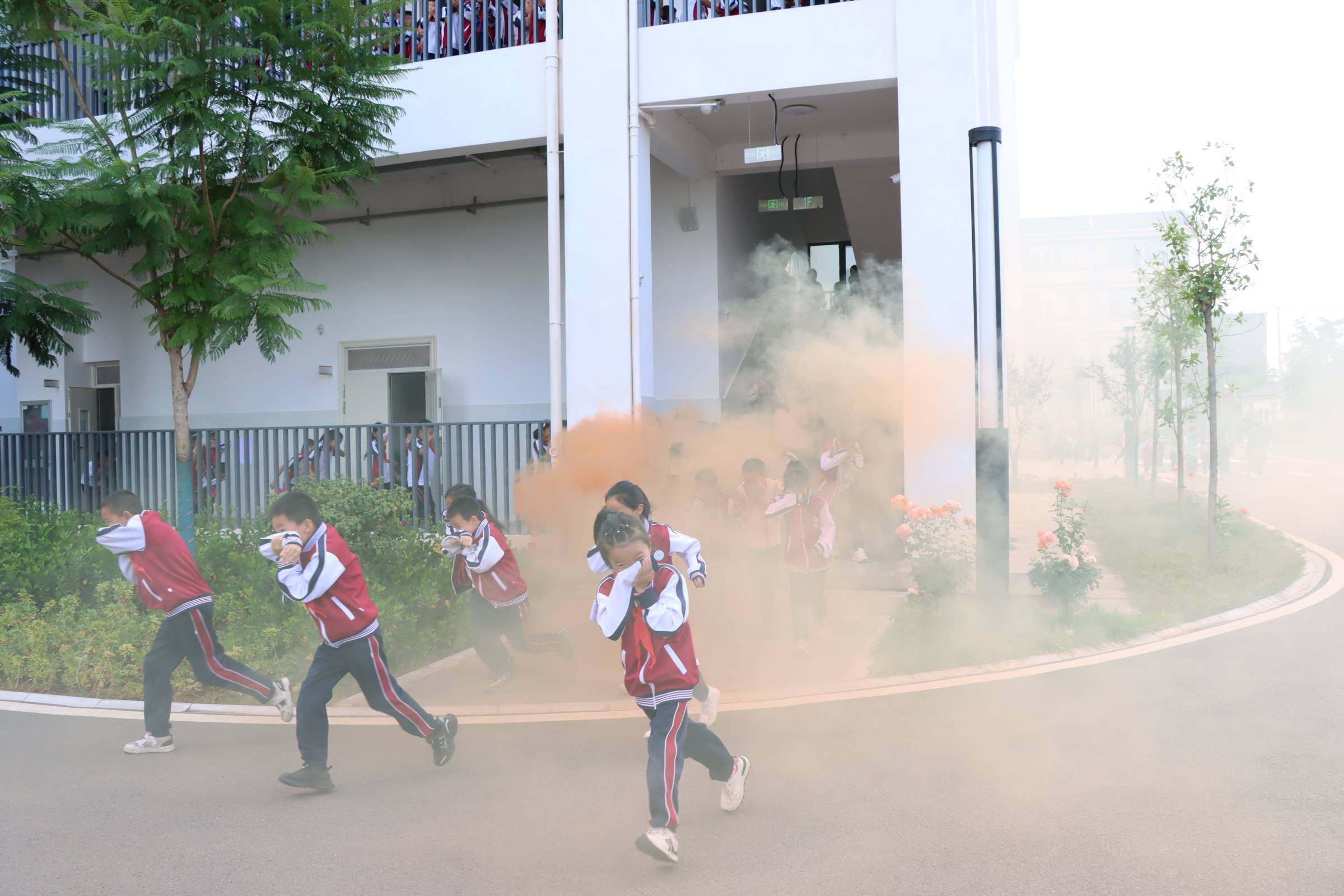 会议首先进行现场学习观摩,栋川小学校长王进红向参会人员介绍了学校消防设施建设及管理使用情况,担任本次演练活动的总指挥,演练现场,随着烟雾弥漫,消防警报响起,教学楼内1200余名师生在学校的指挥下跟随引导人员迅速、有序逃离现场,模拟被困师生得到消防员的及时救助。在学校操场上,消防救援人员为师生们现场示范了消防栓、灭火器的正确使用方法。