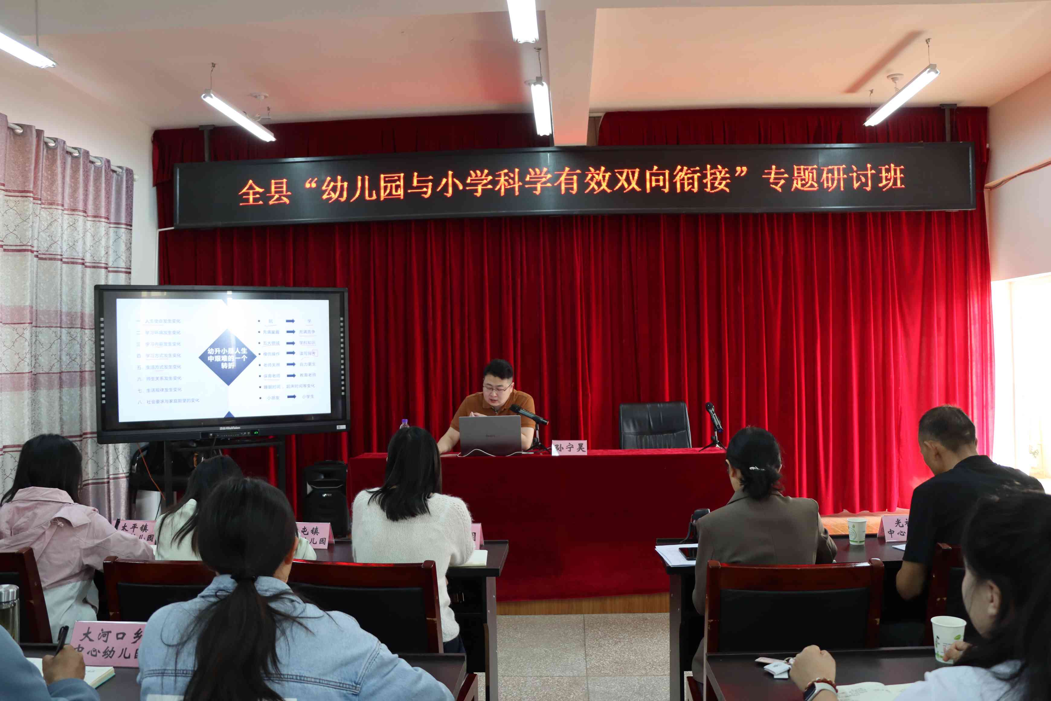 县教体局职民教育股负责人作开班动员讲话:“幼小衔接是基础教育改革的‘第一公里’,要打破学段壁垒,建立双向奔赴的育人机制,让每个孩子享受有温度、有质量的成长过程。”