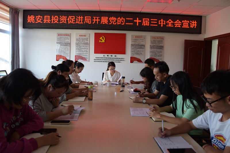 为全面深入学习贯彻党的二十届三中全会精神,引导招商干部把思想和行动统一到党中央决策部署上来。9月29日,姚安县投资促进局召开党组理论学习中心组2024年第十次集中学习会议,局党组书记、局长周晓英开展党的二十届三中全会精神宣讲,2名党政班子成员围绕“精准把握实质内涵,聚力抓好改革落实”开展主题交流研讨,县投资促进局全体干部职工参加会议。