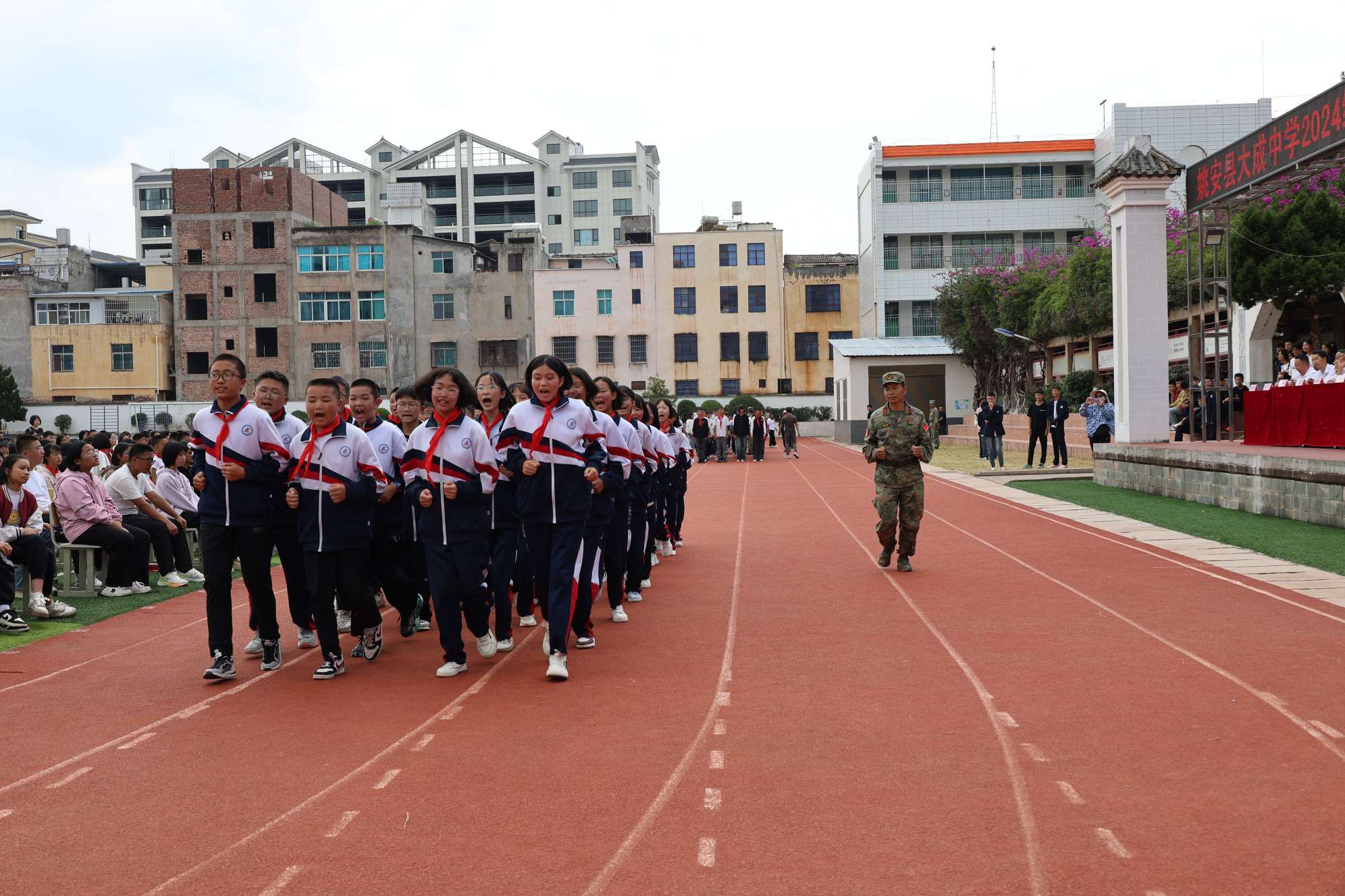 在训练中,同学们发扬了不怕苦、不怕累的精神,克服了晴天的高温天气、战胜了阴天的风吹雨淋。他们始终服从命令、积极参与,严守纪律、勇于挑战。他们以饱满的热情、昂扬的斗志、威武的军姿展示了当代中学生朝气蓬勃的精神风貌,展示了大成学子奋发向上的青春风采。各方队教官以身作则,悉心指导,严格要求,在训练过程中渗透了“听党指挥、能打胜仗、作风优良、纪律严明”的新时代治军思想,为青年学子植入了红色基因。