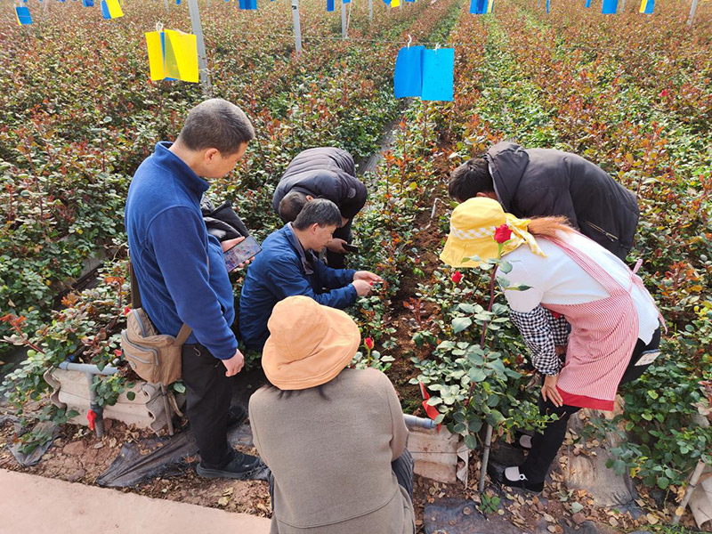 受冬季低温、霜冻影响,部分企业的切花月季主流品种“粉红雪山”出现枝条过细、花色不鲜艳、花瓣皱缩等问题,在实地调研与技术交流后,农科服务团向企业提出肥水比例与灌溉时间调整建议,并向企业技术人员亲身示范切花月季株型培养方法,帮助企业提高产量。