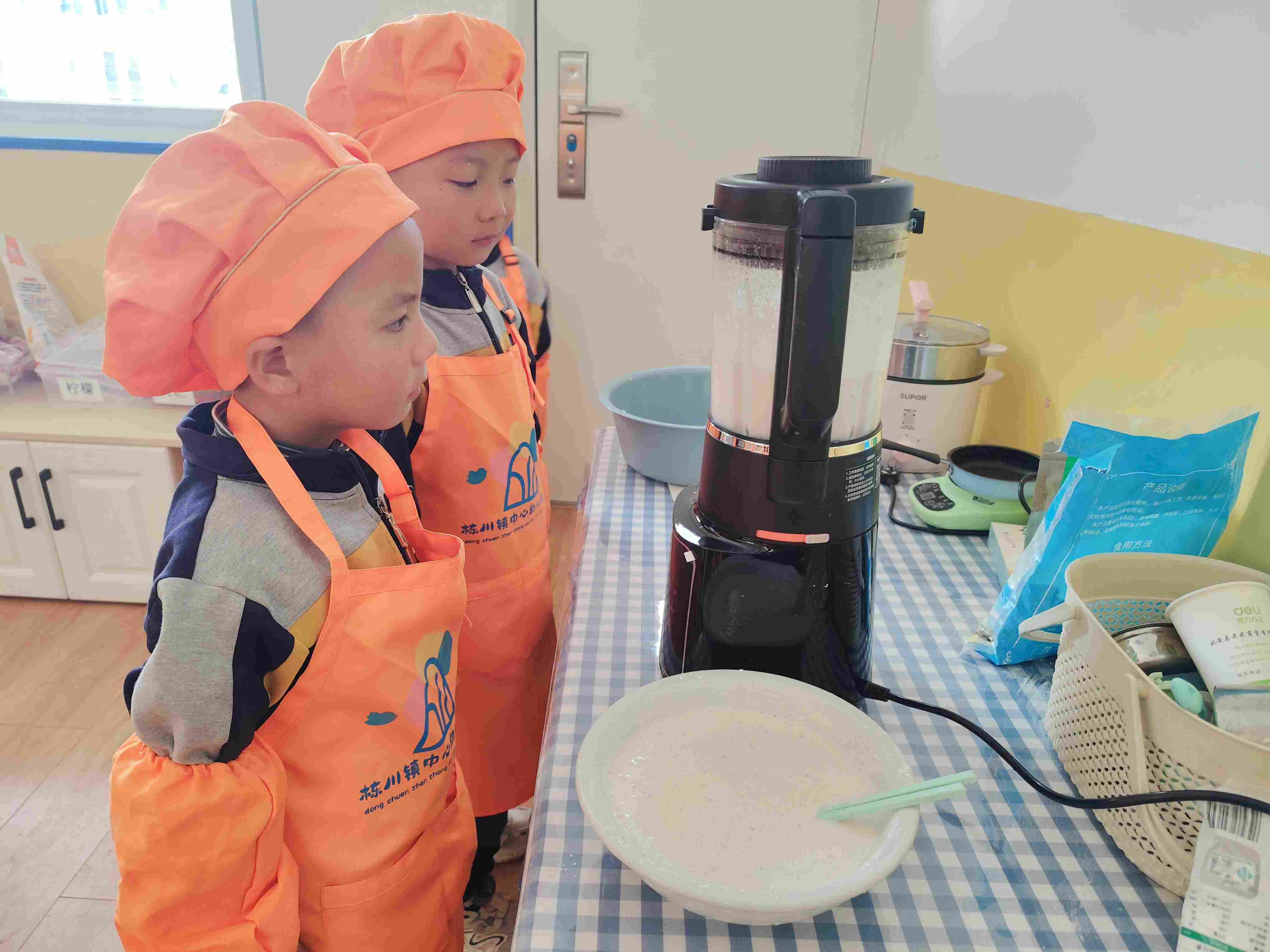 在玉米汁制作区,孩子们将玉米粒剥下来,放进榨汁机里,看着玉米粒在机器里变成细腻的玉米汁,眼中满是惊喜。当温热的玉米汁倒进杯子里,孩子们迫不及待地尝了一口,“真好喝!”甜甜的笑声充满了整个教室。