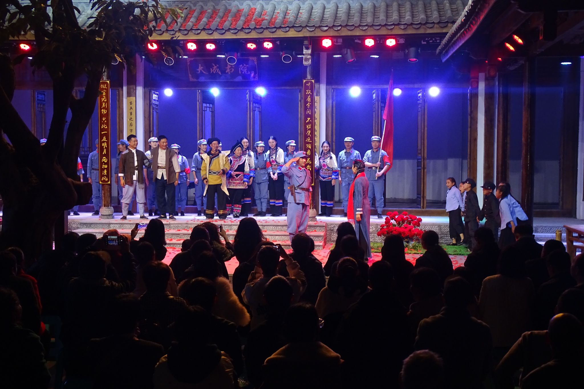 在光禄古镇高雪君祠旁,一场70分钟的红色原创庭院剧《赤子之心》正在上演。演员们以真挚演绎,生动重现了1936年红军长征过姚安四天三夜间,与姚安老百姓守望相助、鱼水情深的感人故事。剧情高潮处,不少观众深受触动,悄然拭泪,这份跨越近90年的初心与温情,在光禄古镇的方寸庭院间,让每一位现场观众都经受了一次深刻的红色洗礼。