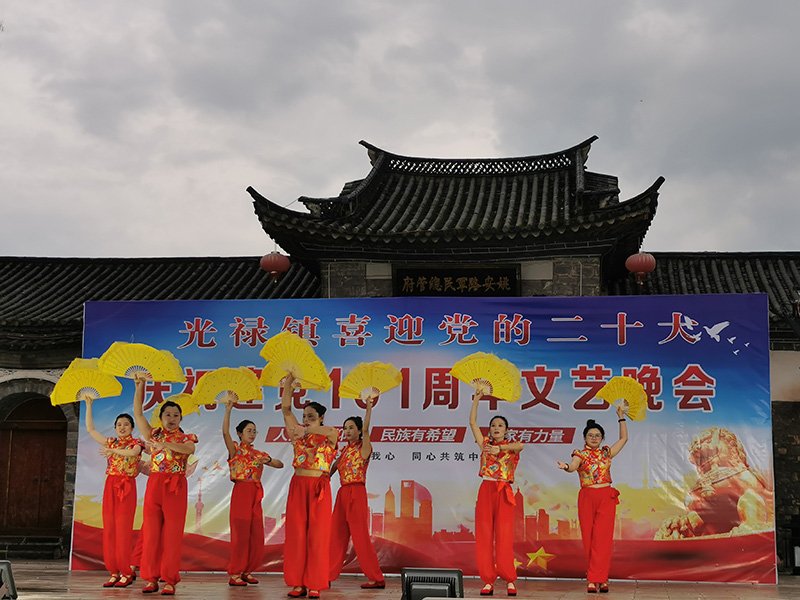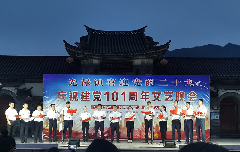 为热烈庆祝中国共产党建党101周年,讴歌党的光辉历程,丰富和活跃全镇干部职工及群众的文化生活,7月1日晚上7点,光禄镇人民政府组织辖区各村(社区)在军民总管府前举办了以“喜迎党的二十大庆祝建党101周年”为主题的文艺晚会。