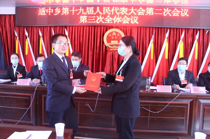 大会选举冯吉洁同志为适中乡人民政府乡长。乡党委书记申光著为新当选的乡人民政府乡长颁发当选证书,新当选的乡长冯吉洁作了表态发言。