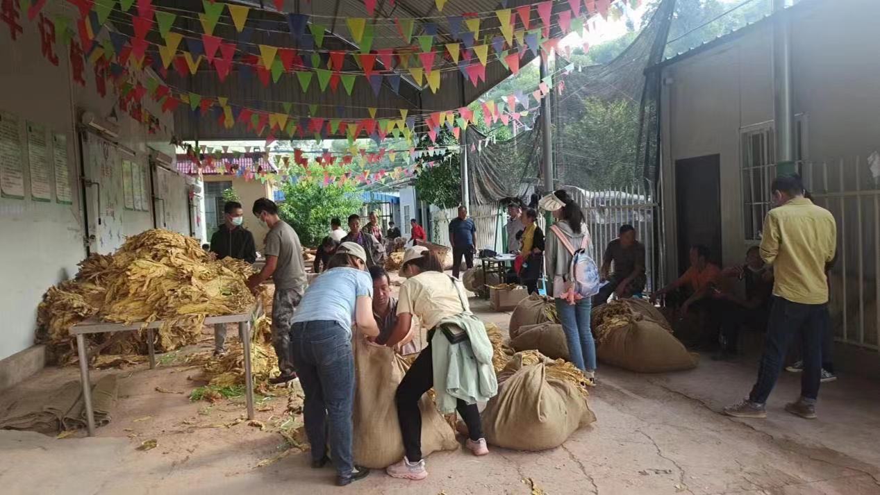 一大早,烤烟收购点人来人往,车辆络绎不绝,烟农们在工作人员的引导下有条不紊地测量体温、进站登记,将一袋袋打包好的“黄金叶”送到指定地点堆放,烟叶收购点工作人员认真地对烤烟进行初检、分级、定级、过磅,整个收购过程繁忙而有序地进行。