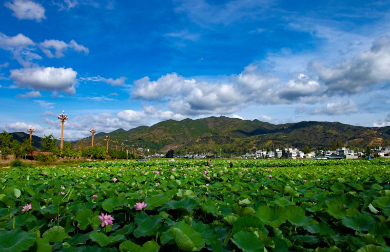 荷花本身内涵极其丰富。自《诗经》起,无论《邶风·简兮》“简兮简兮,方将《万舞》。日之方中,在前上处。硕人俣俣,公庭。《万舞》有力如虎,执辔如组。左手执龠,右手秉翟。赫如渥赭,公言锡爵。山有榛,隰有苓。云谁之思?西方美人。彼美人兮,西方之人兮。”还是《郑风·山有扶苏》“山有扶苏,隰有荷华。不见子都,乃见狂且。山有桥松,隰有游龙。不见子充,乃见狡童。”或者《陈风·泽陂》“彼泽之陂,有蒲与荷。有美一人,伤如之何?寤寐无为,涕泗滂沱。彼泽之陂,有蒲与蕳。有美一人,硕大且卷。寤寐无为,中心悁悁。彼泽之陂,有蒲菡萏。有美一人,硕大且俨。寤寐无为,辗转伏枕。”到《采莲曲》,再到贺知章、杨万里、周敦颐、李渔乃至朱自清,海量诗文极尽表述。正如光禄古镇的田园荷花,与两千多年的历史文化相呼吸,与周围的乡村相连接,与附近的山脉相映衬,交汇一体,浑然天成。