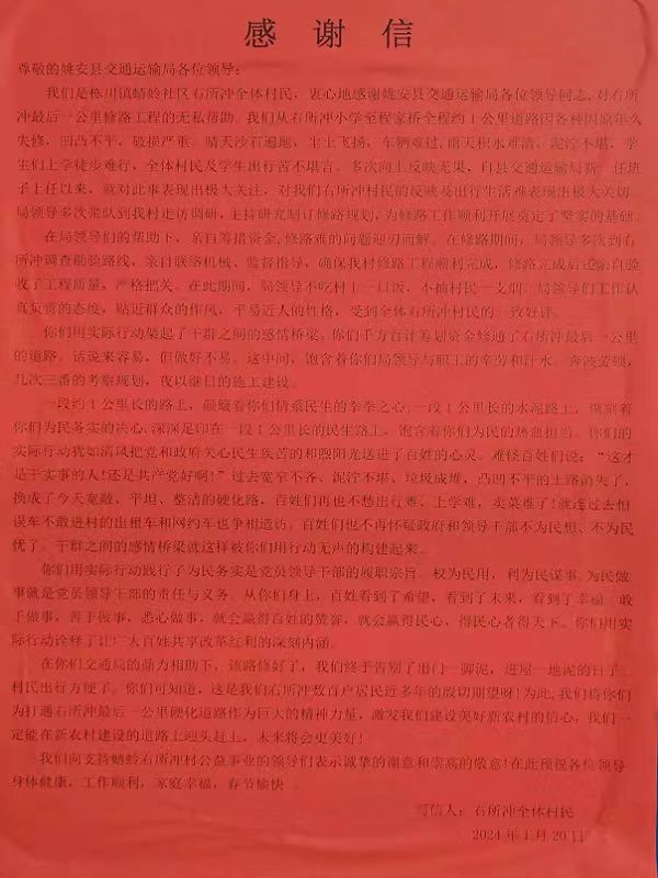 近日,姚安县栋川镇蜻蛉村委会右所冲村的村民代表来到姚安县交通运输局办公室,带来了代表着全体村民真挚谢意的《感谢信》,感谢政府和交通部门为他们修通了家门口的道路,解决了他们出行难的大问题。
