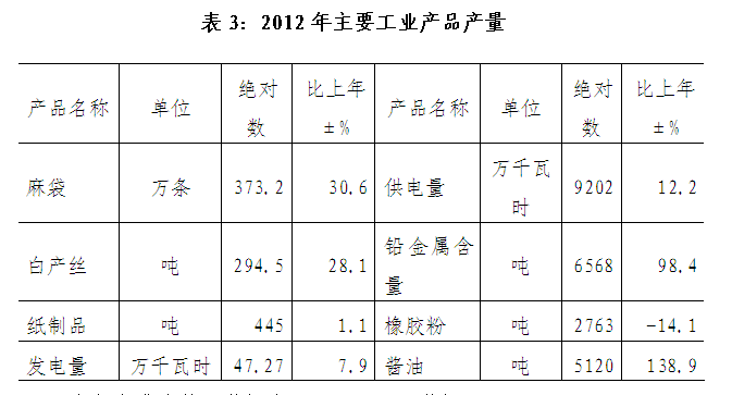 初步核算,2012年全县完成生产总值293747万元,按可比价格计算(下同),同比增长12.1%。其中:第一产业增加值112000万元,增长7.5%,对全县经济增长的贡献率为21.78%,拉动经济增长2.64个百分点;第二产业增加值87962万元,增长15.3%,对全县经济增长的贡献率为39.93%,拉动经济增长4.83个百分点;第三产业增加值93785万元,增长13.9%,对全县经济增长的贡献率为38.29%,拉动经济增长4.63个百分点;三次产业结构比为38.13:29.94:31.93。按公安户籍人口计算的人均GDP为11810元,比上年增加2320元,增长17.7%。非公有制经济增加值125214万元,占GDP的比重为42.6%,比上年下降1.3个百分点。