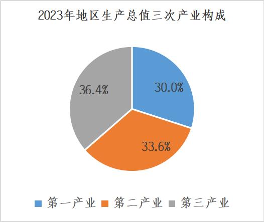 从三次产业看:第一产业实现增加值为30.80亿元,同比增长4.7%,增幅比全州(4.6%)高0.1个百分点,居全州十县市第二位,对全县经济增长的贡献率为25.1%,拉动姚安经济增长1.41个百分点。第二产业实现增加值为34.49亿元,同比增长9.6%,增幅比全州(6.9%)高2.7个百分点,居全州十县市第三位,仅次于禄丰县、大姚县,对全县经济增长的贡献率为54.1%,拉动姚安经济增长3.03个百分点。第三产业实现增加值为37.38亿元,同比增长3.0%,增幅比全州(4.3%)低1.3个百分点,居全州十县市第八位,对全县经济增长的贡献率为20.8%,拉动姚安经济增长1.16个百分点。经济结构进一步优化,三次产业结构由2022年的28.8:34.6:36.6调整到2023年的30.0:33.6:36.4。