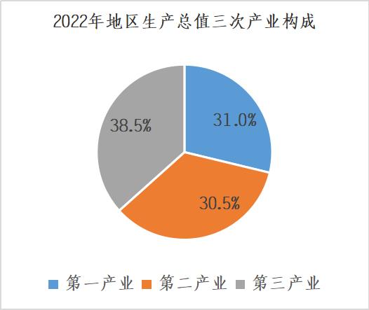 从三次产业看:第一产业实现增加值为28.97亿元,同比增长5.3%,增幅比全州(5.1%)高0.2个百分点,居全州十县市第二位,仅低于元谋,对全县经济增长的贡献率为19.5%,拉动姚安经济增长1.62个百分点。第二产业实现增加值为34.81亿元,同比增长15.8%,增幅比全州(10.9%)高4.9个百分点,居全州十县市第二位,仅次于禄丰,对全县经济增长的贡献率为55.8%,拉动姚安经济增长4.63个百分点。第三产业实现增加值为36.89亿元,同比增长5.1%,增幅比全州(3.1%)高2个百分点,居全州十县市第三位,对全县经济增长的贡献率为24.7%,拉动姚安经济增长2.05个百分点。经济结构进一步优化,三次产业结构由2021年的30.7:30.2:39.1调整到2022年的28.8:34.6:36.6。