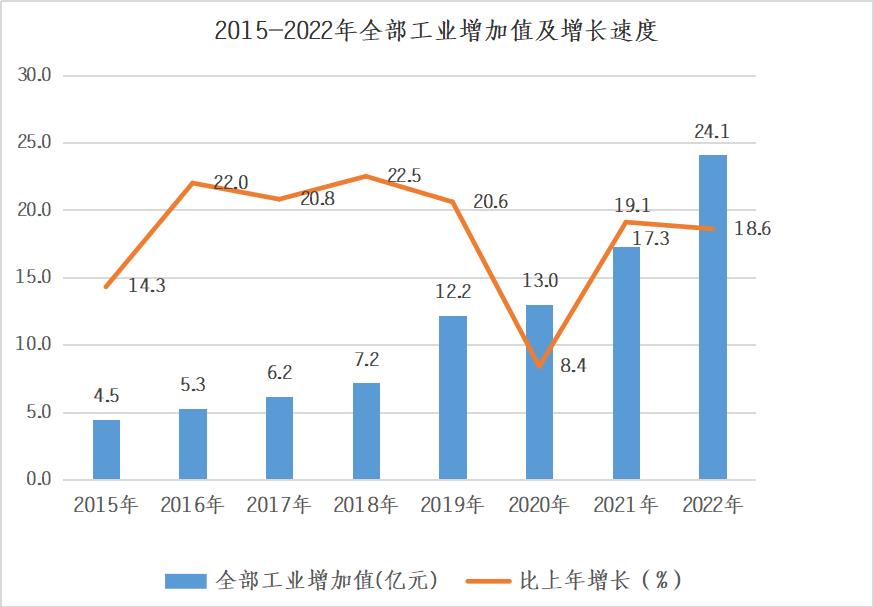 2022年,全部工业企业实现工业增加值24.09亿元,按可比价计算比上年增长18.6%(下同)。分门类看:采矿业增加值0.61亿元,增长21.2%;制造业增加值12.97亿元,增长16.8%;电力、热力、燃气及水生产和供应业增加值10.52亿元,增长21.2%。其中,规上工业企业实现工业增加23.1亿元,同比增长23.8%。