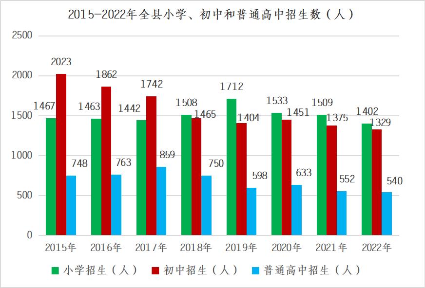 2022年年末,全县拥有各类学校163所,教职员工2522人,专任教师1810人。其中:拥有高中1所,教职员工205人,专任教师143人,招生540人,在校学生1652人,毕业生567人;初中9所,教职员工546人,专任教师441人,招生1329人,在校学生4177人,毕业生1487人;中等职业技术学校2所,教职员工66人,专任教师50人,招生79人,在校学生150人,毕业生50人;小学71所,包括完全小学58所,教学点13个,教职员工936人,专任教师775人,招生1402人,在校学生9051人,毕业生1399人;幼儿园80所,包括公办68所,民办12所,拥有教职员工769人,其中专任教师401人,招收幼儿2446人;在校幼儿5511人,毕业幼儿1695人。