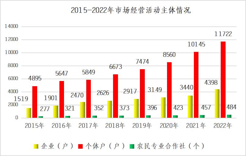 市场主体持续增加。2022年全县市场主体登记注册增加2562户,年末各类市场主体登记注册达到16604户。