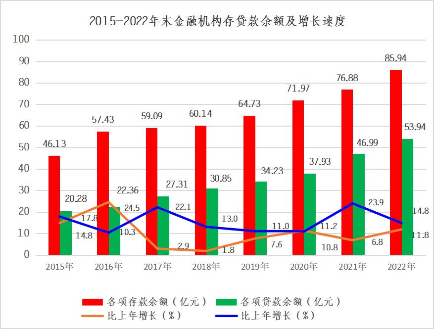 金融市场运行平稳。2022年,年末全部金融机构各项存款余额85.94亿元,比年初增加9.06亿元,增长11.8%;其中住户存款余额67.23亿元,比年初增加6.79亿元,增长11.2%,占全部金融机构各项存款余额的78.2%。全部金融机构各项贷款余额53.94亿元,比年初增加6.95亿元,增长14.8%。在全部金融机构各项贷款余额中:住户贷款余额24.27亿元,比年初增加2.32亿元,增长10.6%,占全部金融机构各项贷款余额的45.0%;非金融企业及机关团体贷款29.67亿元,比年初增加4.63亿元,增长18.5%,占全部金融机构各项贷款余额的55.0%。
