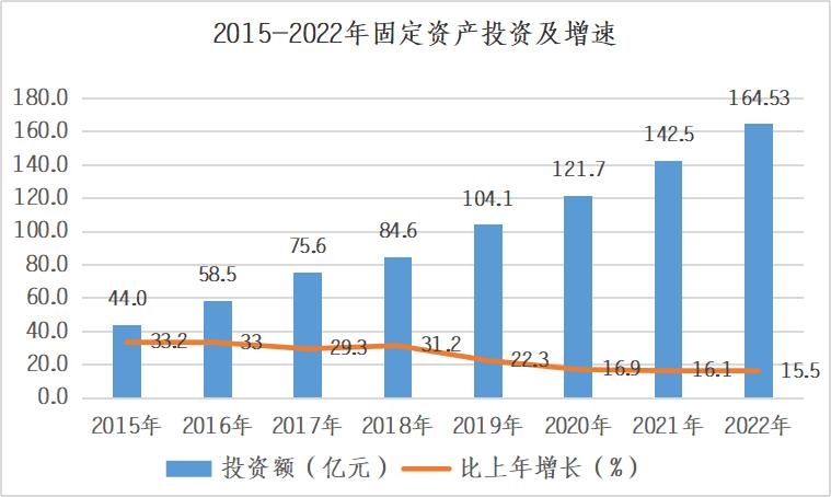 2022年,全县固定资产投资(不含农户)164.53亿元,同比增长15.5%。