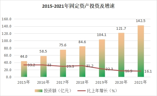 2021年,全县固定资产投资(不含农户)142.45亿元,同比增长16.1%,两年平均增长16.1%。