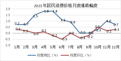 市场物价持续上涨。2021年全年居民消费价格总水平比上年上涨0.9%,其中:食品类下降2.2%。商品零售价格总水平比上年上涨1.0%。