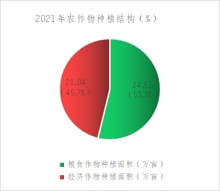 农作物种植面积持续增加。全年农作物种植面积46万亩,比上年增加0.32万亩,增长0.7%,其中: 粮食作物种植面积24.51万亩,比上年增加0.06万亩,增长0.3%;经济作物种植面积21.04万亩,比上年减少0.19万亩,下降0.9%。