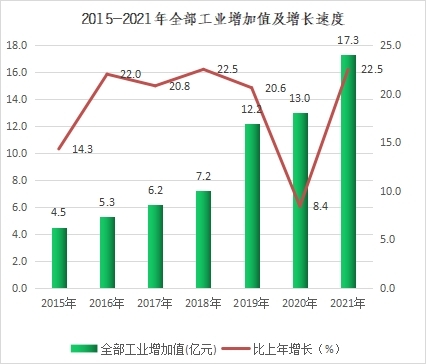 2021年,全部工业企业实现工业增加值17.27亿元,按可比价计算比上年增长19.1%(下同)。分门类看:采矿业增加值0.48亿元,增长-17.8%;制造业增加值10.50亿元,增长33.0%;电力、热力、燃气及水生产和供应业增加值6.29亿元,增长5.8%。其中,规上工业企业实现工业增加16.5亿元,同比增长22.5%。