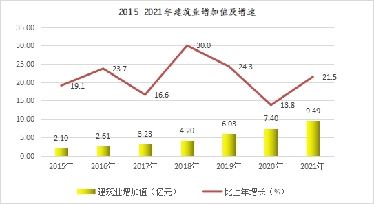 全县资质内本地建筑业企业完成建筑业总产值33.67亿元,比上年增长50.1%, 全年建筑业实现增加值9.49亿元,比上年增长21.5%。