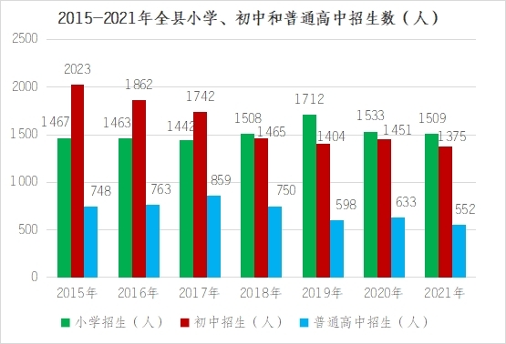 2021年年末,全县拥有各类学校164所,教职员工1933人,专任教师1799人。其中:拥有高中1所,教职员工230人,专任教师 194人,招生552人,在校学生1726人,毕业生724人;初中9所,教职员工586人,专任教师485人,招生 1375人,在校学生4308人,毕业生1542人;中等职业技术学校 2所,教职员工53人,专任教师41人,招生151 人,在校学生240人,毕业生20人;小学71所,包括完全小学58所,教学点13个,教职员工1064人,专任教师844人,招生1509人,在校学生9096人,毕业生1459人;幼儿园81所,包括公办67所,民办14所,拥有教职员工426人,其中专任教师 235人,招收幼儿1673人;在校幼儿5125人,毕业幼儿1653人。