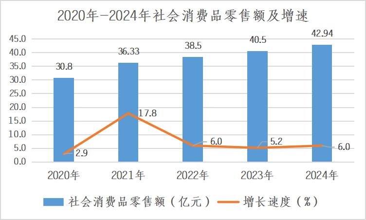 市场销售稳定增长。全年社会消费品零售总额42.94亿元,比上年增长6.0%。