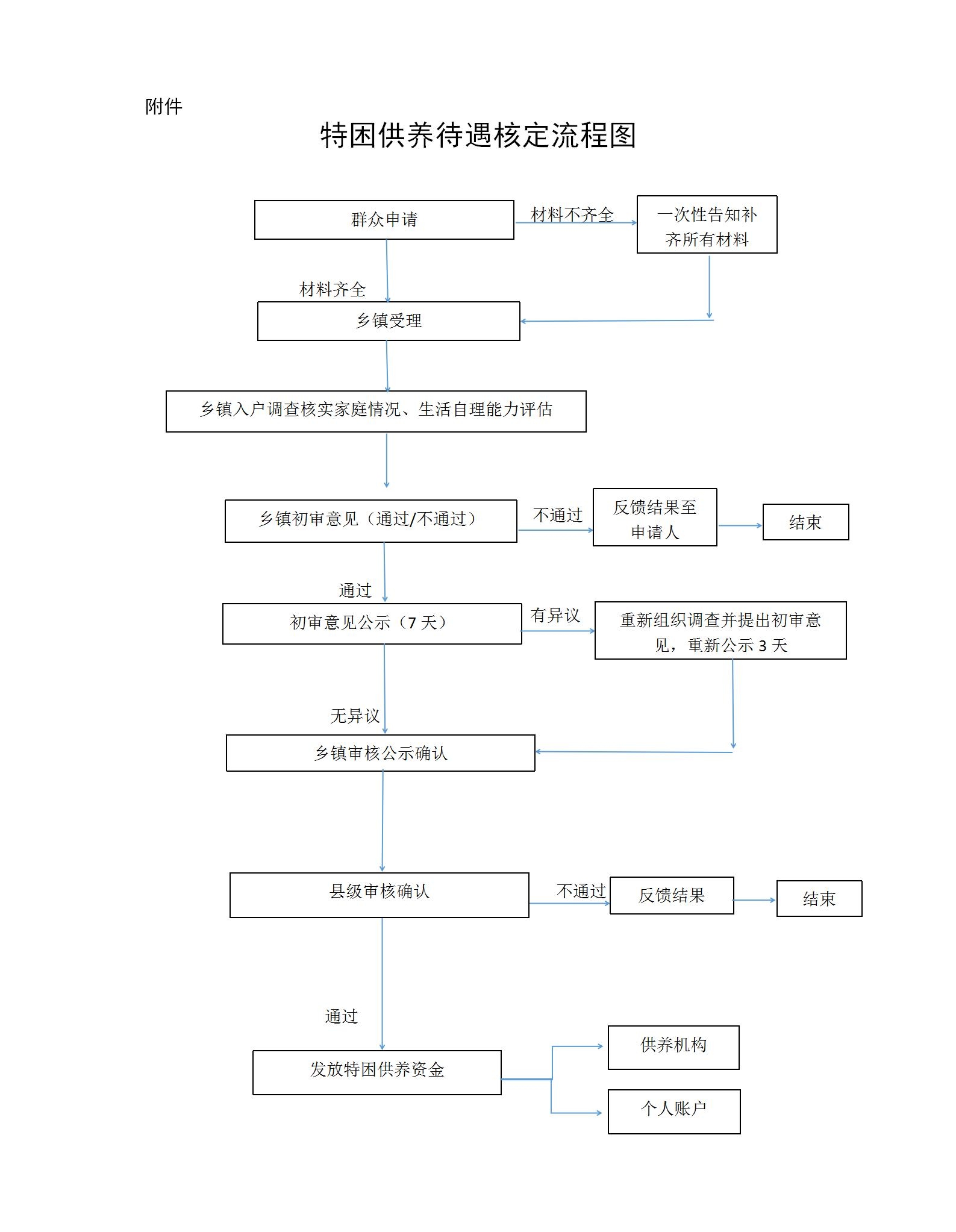 (五)审批。县民政局全面审核乡镇人民政府上报的申请、调查材料和初审意见,在10个工作日内提出确认意见。对在初审和审核确认阶段接到投诉、举报的特困人员救助供养申请,县民政局应入户调查。对符合救助供养条件的申请,县民政局及时予以确认,建立救助供养档案,从确认之日下月起给予救助供养待遇,并通过乡镇人民政府在申请人所在村(社区)公布。对不符合救助供养条件不予确认同意的,在3个工作日内通过乡镇人民政府书面告知申请人并说明理由。