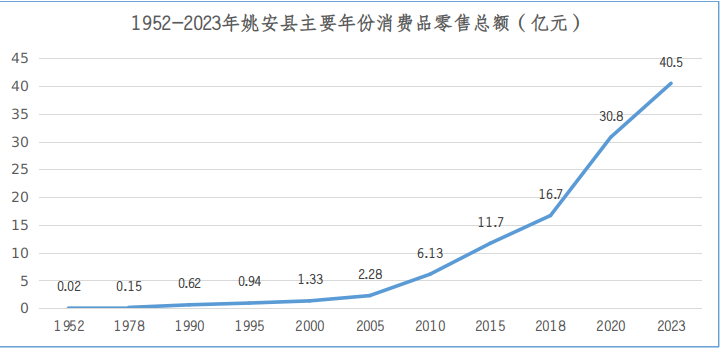 随着收入较快增长,居民消费能力显著提升,消费结构升级趋势明显,全县社会消费品零售总额1952年由0.02亿元上升至2023年的40.5亿元,是1952年的2025倍,年均增长11.1%,期间1978年突破1千万元、达到1154万元,1997年突破1亿元、达到1.15亿元,2014年突破10亿元、达到10.45亿元,2023年达到40.5亿元。2023年全县城镇居民人均消费支出达28151 元,全县农村居民人均消费支出达14766元。家电、汽车等耐用消费品拥有量大幅增加,居住条件显著改善。党的十八大以来,农村居民人均可支配收入实际增速连续多年快于城镇居民,城乡居民收入差距不断缩小,城乡居民人均可支配收入之比已由2004年的4.36下降至2023年2.65。
