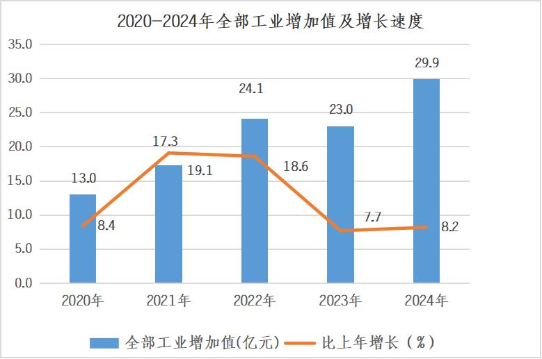 2024年,全部工业企业实现工业增加值29.94亿元,按可比价计算比上年增长8.2%(下同)。规模以上工业增加值增长6.6%。分门类看:采矿业增加值0.72亿元,下降6.8%;制造业增加值16.26亿元,增长22.5%;电力、热力、燃气及水生产和供应业增加值12.97亿元,下降2.4%。