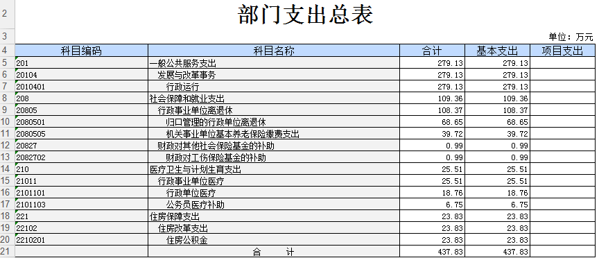 2017年部门预算基本支出 437.83万元,其中:工资福利支出327.38万元,商品服务支出40.11万元,对家庭和个人的补助支出 70.34万元。其中工资支出包括:在职人员的基本工资、津贴补贴、奖金、五险一金;商品服务支出包括:办公费、工会经费、公务交通运行维护费、其他交通费用;对个人和家庭补助包括:退休费、抚恤金。