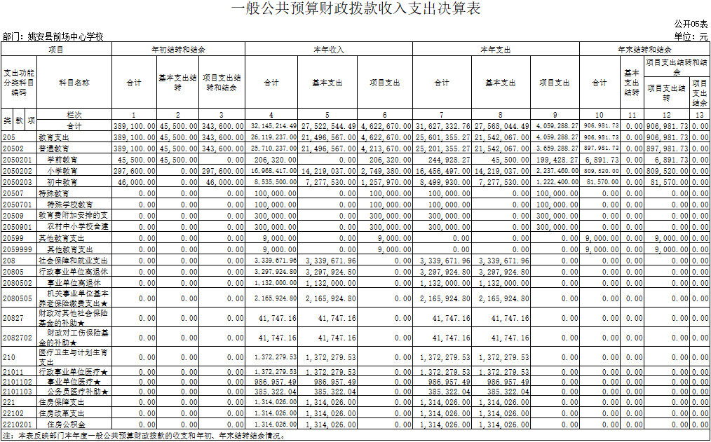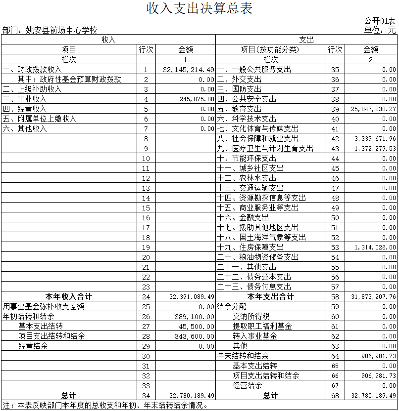 2017年一般公共预算财政拨款支出中,上年结转389100元,本年收入32145214.49元,本年年末结转和结余906981.73元。