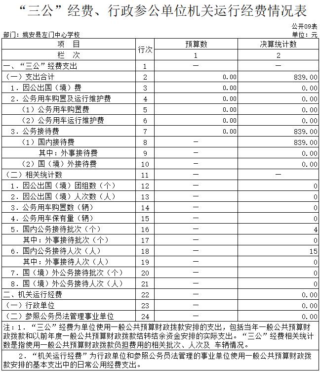本年本单位没有因公出国(出境),没有公务用车购置及运行维护费,公务接待费用839元。