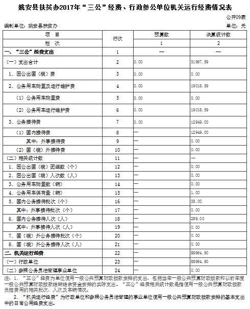 2017年度一般公共预算财政拨款“三公”经费支出预算为30000.00元,支出决算为32000.00元,完成预算的106.66%。其中:因公出国(境)费支出决算为0元,完成预算的0%;公务用车购置及运行费支出决算为19000.00元,完成预算的63.33%;公务接待费支出决算为13000.00元,完成预算的43.33%。2017年度一般公共预算财政拨款“三公”经费支出决算数大于预算数的主要原因是由于2017年是全县脱贫摘帽年,各类检查、验收频繁,加大了经费支出。