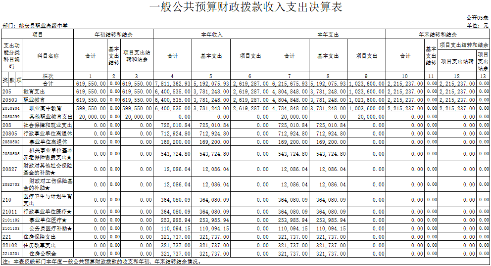 2017年一般公共预算财政拨款支出中,上年结转619550元,其中基本支出结转0元,项目支出结转619550元;本年收入7811362.93元,其中基本支出5192075.93元,项目支出2619287元、本年支出6215675.93元,其中基本支出5192075.93元,项目支出1023600元;本年年末结转和结余2215237元,其中基本支出结转0元,项目支出结转2215237元。