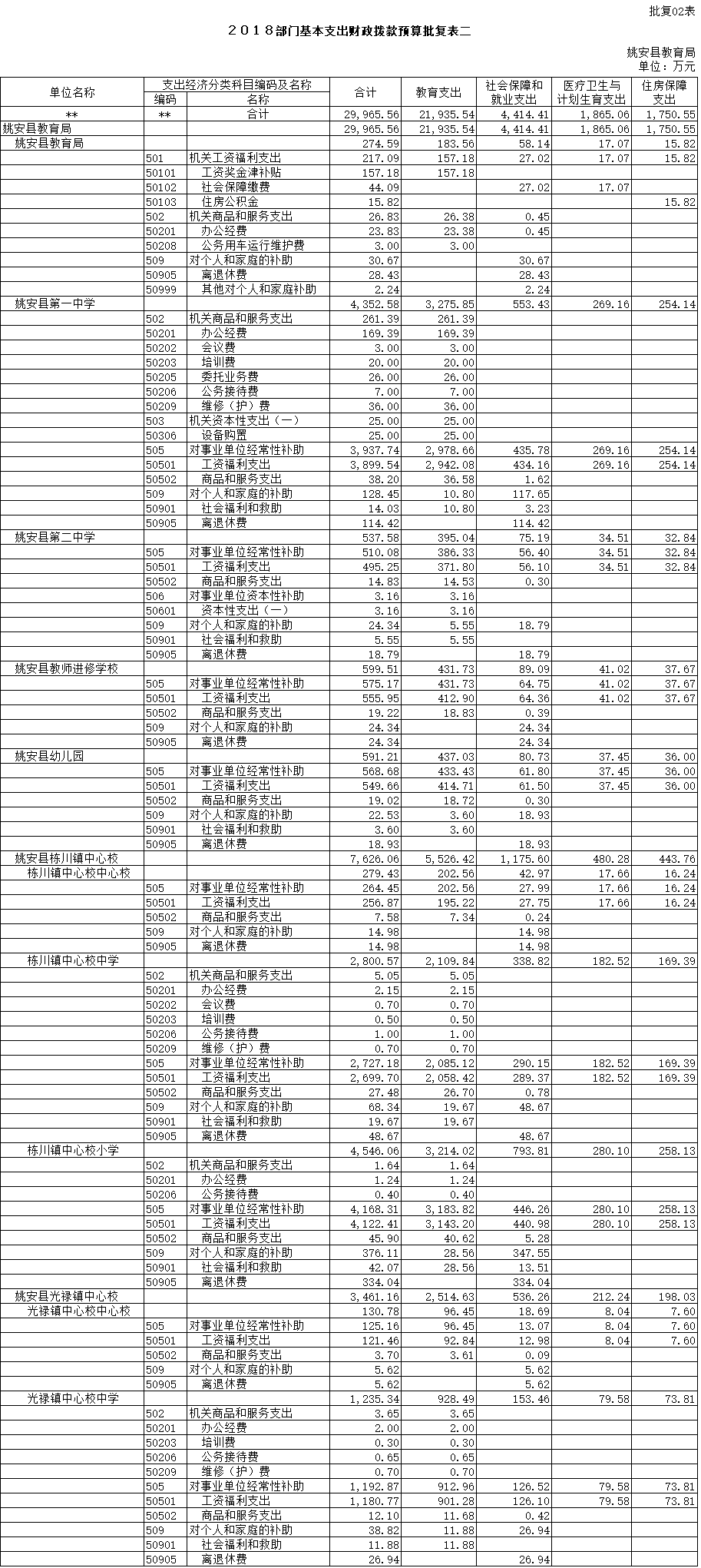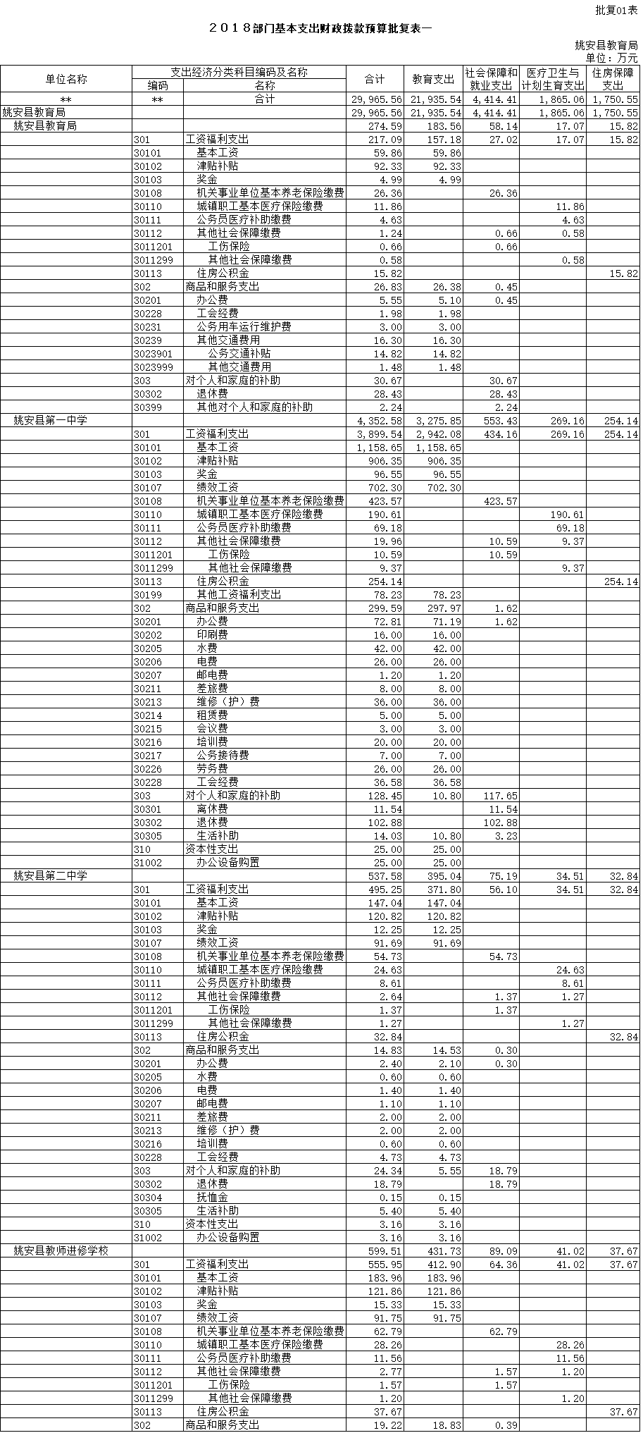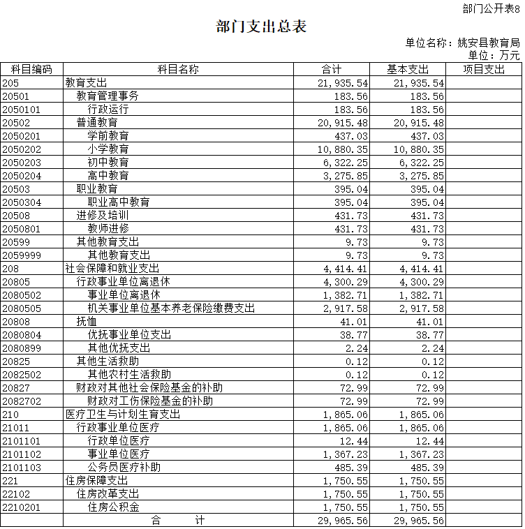 姚安县教育局2018年财政拨款预算总收入29965.56万元,其中:本级财力29965.56万元。2018年财政拨款预算总支出29965.56万元。按支出功能科目分类,支出列“ 205类01款01项”预算支出183.56万元,主要反映教育局机关人员、办公支出;“ 205类02款01项”预算支出437.03万元,主要反映县幼儿园人员、办公支出;“ 205类02款02项”预算支出10880.35万元,主要反映全县小学教育人员、办公支出;“ 205类02款03项”预算支出6322.25万元,主要反映全县初中教育人员、办公支出;“ 205类02款04项”预算支出3275.85万元,主要反映姚安一中人员、办公支出;“ 205类03款04项”预算支出395.04万元,主要反映姚安县职业高级中学人员、办公支出;“ 205类08款01项”预算支出431.73万元,主要反映姚安县教师进修学校人员、办公支出;“ 205类99款99项”预算支出9.73万元,主要反映人员、办公支出;“ 208类05款02项”预算支出1382.71万元,主要反映离退休人员改革性补贴支出;“ 208类05款05项”预算支出2917.58万元,主要反映机关事业单位养老保险支出;“ 208类08款04项”预算支出38.77万元,主要反映中小学校临时人员经费支出;“ 208类08款99项”预算支出2.24万元,主要反映中小学校临时人员经费支出;“ 208类25款02项”预算支出0.12万元,主要反映弥兴中心学校李桂兰医疗补助经费支出;“ 208类27款02项”预算支出72.99万元,主要反映中小学校教职工工伤保险基金支出;“ 210类11款01项”预算支出12.44万元,主要反映机关单位医疗保险经费支出;“ 210类11款02项”预算支出1367.23万元,主要反映事业单位医疗保险经费支出;“ 210类11款03项”预算支出485.39万元,主要反映机关事业公务员医疗补助支出;“ 221类02款01项”预算支出1750.55万元,主要反映机关单位住房公积金经费支出。