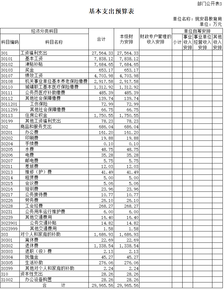 2018年部门预算基本支出29965.56万元,其中:工资福利支出27564.33万元,商品服务支出686.04万元,对家庭和个人的补助支出1686.93万元, 资本性支出28.26万元。主要反映姚安县教育系统2018年保障机关事业单位工作正常开展方面的支出。