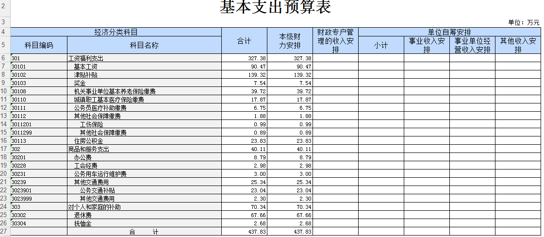 2017年部门预算基本支出 437.83万元,其中:工资福利支出327.38万元,商品服务支出40.11万元,对家庭和个人的补助支出 70.34万元。其中工资支出包括:在职人员的基本工资、津贴补贴、奖金、五险一金;商品服务支出包括:办公费、工会经费、公务交通运行维护费、其他交通费用;对个人和家庭补助包括:退休费、抚恤金。