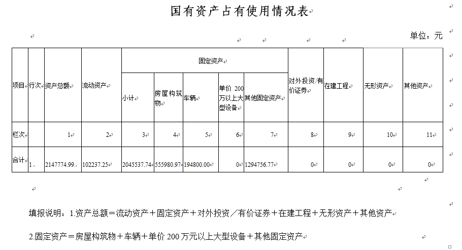 截至2018年12月31日,中共姚安县委老干部局资产总额2147774.99元,其中,流动资产102237.25元,固定资产2045537.74元,对外投资及有价证券0元,在建工程0元,无形资产0元,其他资产0元(具体内容详见附表)。与上年相比,本年资产总额减少17526.13元,减少0.81%,其中固定资产增加11269.00元,增加0.55%。处置房屋建筑物0平方米,账面原值0元;处置车辆0辆,账面原值0元;报废报损资产0项,账面原值0元,实现资产处置收入0元;出租房屋0平方米,账面原值0元,实现资产使用收入0元。